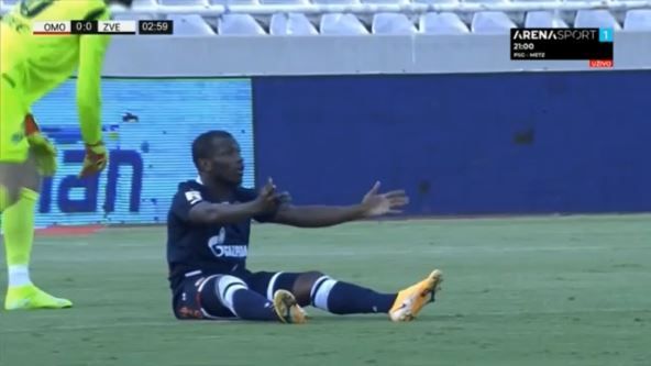 Njega je sa leđa oborio jedan fudbaler Omonije, na travi je zavržio napadač Zvezde i pokazivao sudiji Krisu Kavanagu da je to za crveni karton pošto ga je srušio poslednji igrač odbrane, međutim engleski arbitar se nije oglasio.