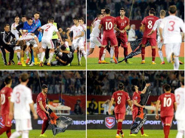 U jednom trenutku meča iznad terena se pojavio dron na kome su bili istaknuti simboli takozvane "Velike Albanije". Tu je bila mapa sa teritorijama na koje Albanci imaju pretenzije, a na zastavi koju je dron nosio nalazile su se i istaknute ličnosti albanske istorije.