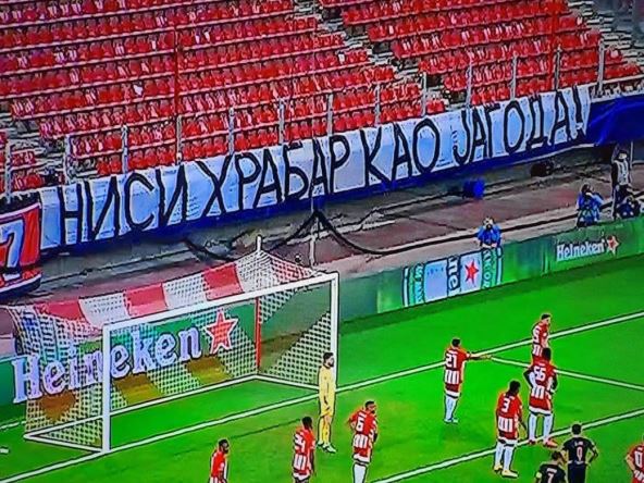 Radi se o tribini na kojoj se inače okuplja navijačka grupa Olimpijakosa "Gejt 7", a na njoj je bio istaknut transparent sa natpisom "Nisi hrabar kao Jagoda".