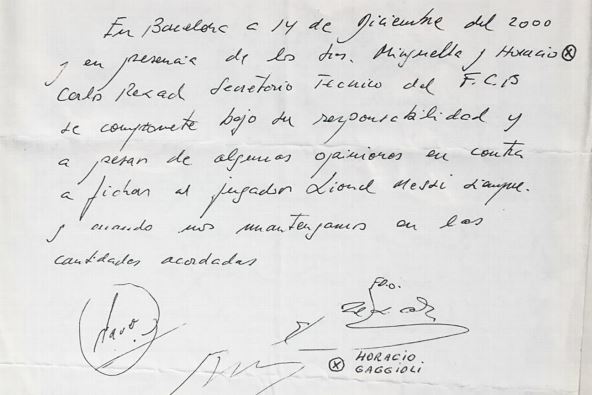 "U Barseloni, 14. decembra 2000. godine, u prisustvu gospode Mingele i Horasija (obojica fudbalski agenti, prim. novin), Karles Rešak, tehnički sekretar FK Barselone, pod svojom odgovornošću i uprkos nekim suprotnim mišljenjima, potvrđujem angažovanje Lionela Mesija sve dok se držimo dogovorenih iznosa".