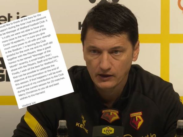 "Želim da se zahvalim navijačima na podršci tokom perioda tokom kog sam imao tu čast da budem menadžer Votforda. Žao mi je što vas nismo imali bliže uz sebe zbog pandemije koronavirusa, jer sam siguran da biste nam vašom snagom na stadionu pomogli na terenu. Napuštam klub zahvalan na svemu što smo uradili moj tim, igrači i ja, zajedno. Bila je velika čast dobiti priznanje za menadžera meseca, mali trofej koji sam podelio sa igračima, štabom i navijačima.Na kraju, želim sve najbolje Votfordu, da ostvari želju da izbori promociju u viši rang na kraju sezone i ako uspete u tome, biću još ponosniji na moj doprinos klubu za ovih 20 mečeva. Srećan Božić svima i sve najbolje "stršljenovi"", napisao je Vladimir Ivić.