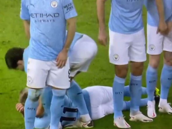Namestio se živi zid Mančester sitija, a Oleksandr Zinčenko je legao iza da bi sprečio da lopta ode do gola ispod postavljenih fudbalera. Ipak, nije se dobro namestio!