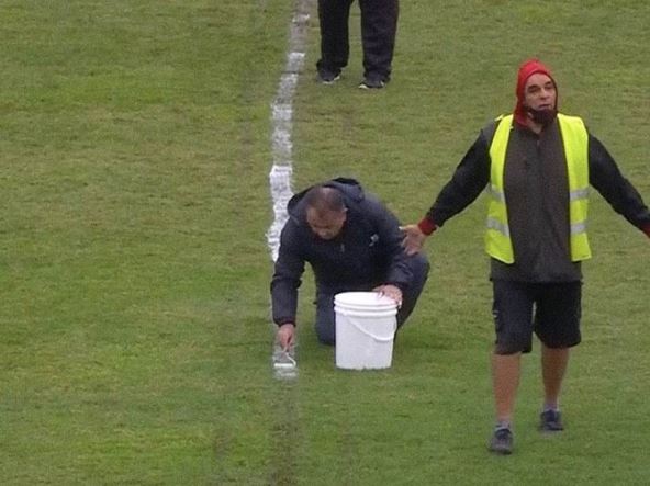 Kako je sudija uopšte dozvolio da se počne duel na terenu na kome se ne vide linije, a pritom je neravan? Na ovom meču su morali da reaguju sa krečom, pa su tako iscrtavali linije terena.