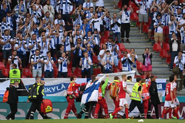 Nakon desetak minuta ukazivanja pomoći na terenu prebačen je u bolnicu, a Finci i Danci na tribinama skandiraju njegovo ime!