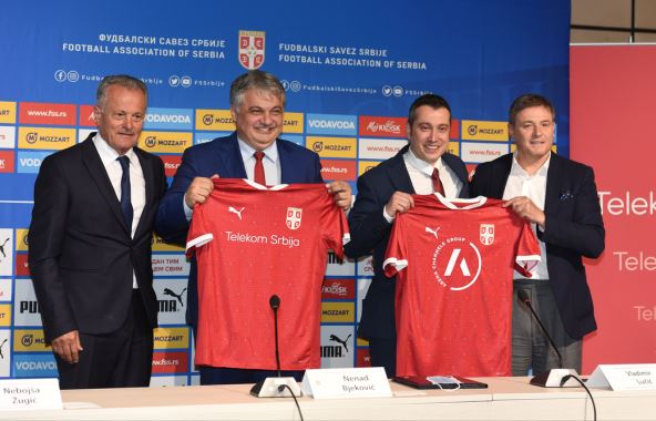 Generalni direktor kompanije Telekom Srbija Vladimir Lučić i zamenik predsednika Fudbalskog saveza Srbije Nenad Bjeković potpisali su trogodišnji ugovor o sponzorstvu koji je Bjeković nazvao istorijskim.