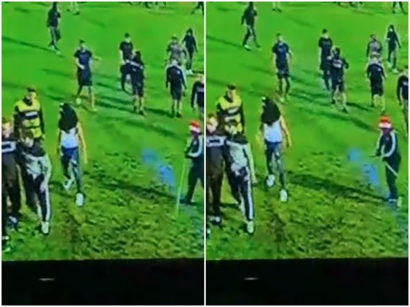 Na jednom snimku vidi se navijač Veleža koji je sa motkom u rukama krenuo ka treneru Borca Nemanji Miljanoviću, ali je, srećom i pribranošću članova domaće ekipe, sprečen fizički kontakt.