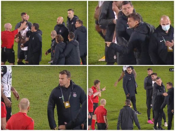 Pomoćnici iz stručnog štaba crno-belih pokušali su da ga odvoje od sudija, gurali ga, ali su uspeli to tek nakon isključenja.