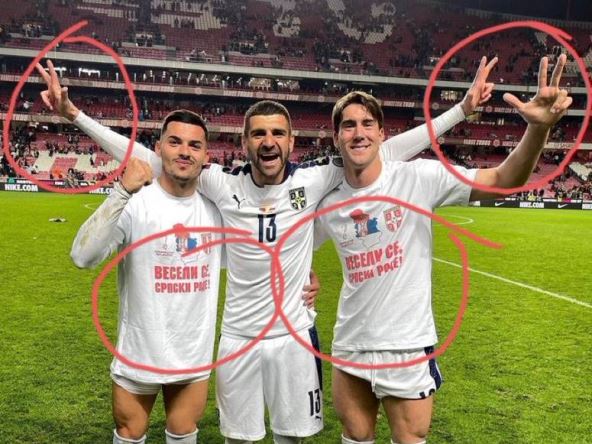 Pored pesme koja je veoma popularna, zasmetale su majice na kojima stoji slogan "Veseli se, srpski rode", ali i gestikulacija sa tri podignuta prsta. Na jednoj od fotografija koje kruže internetom u tim majicama i sa podignutim prstima vide se Nemanja Radonjić, Stefan Mitrović i Dušan Vlahović.