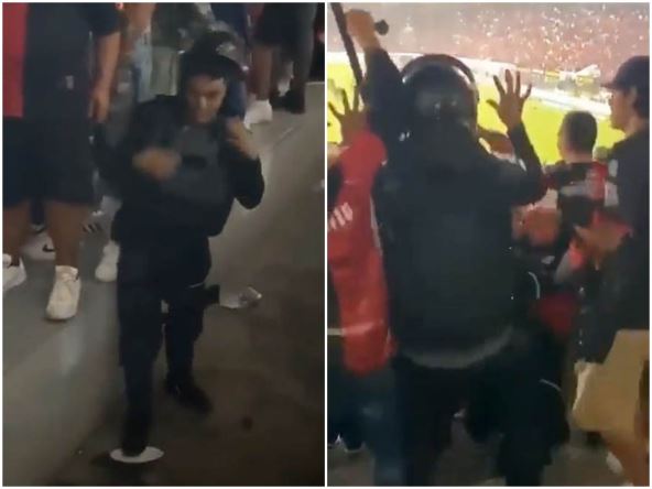 Iako je njegov posao ovde bio da brine o bezbednosti navijača na stadionu, meksički policajac na snimku toliko je pijan da jedva stoji na nogama. Bilo mu je izuzetno teško da se domogne stepenika na kojem su bili navijači, pa su morali da mu pomognu u tome.