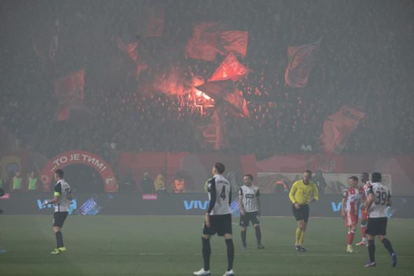Sa tribine na kojoj su najvatreniji navijači crno-belih odgovoreno je velikim brojem baklji i dimnih bombi koje su prvo ubačene pa su pale na atletsku stazu pored terena.