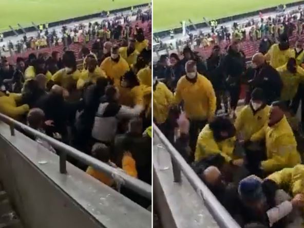 I dok su neki navijači tima iz Menhengladbaha uspeli da se na vreme povuku na bezbedno, snimak koji se pojavio na društvenim mrežama prikazuje jednog koji nije bio te sreće. On je ostao uhvaćen u "džepu", pa je udarce u telo i glavu dobijao od nekoliko redara na meču.