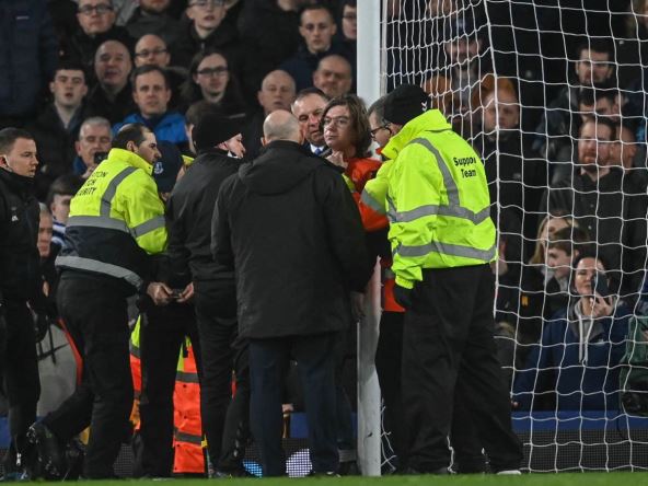 Utakmica Premijer lige Everton - Njukasl prinudno je zaustavljena i to zbog bizarnog razloga. Sve je stalo na sedam minuta jer je jedan čovek uleteo u teren i vezao se za stativu - i to u znak protesta.