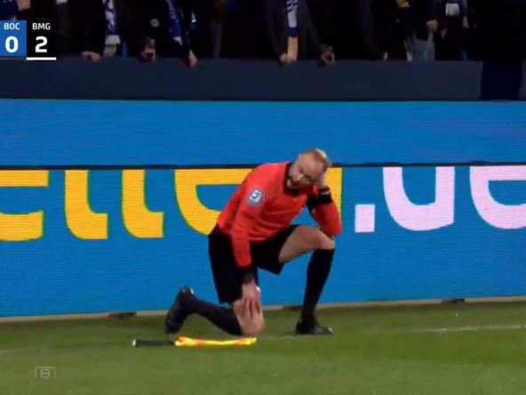 Iz publike sa "Vonovia Rurstadiona" doleteo je u 72. minutu tvrdi predmet, najverovatnije konzerva piva, koji je u glavu pogodio pomoćnika glavnog sudije Benjamina Kortusa, pa je meč između Bohuma i Borusije Menhegladbah (0:2) prekinut i neće biti nastavljen.