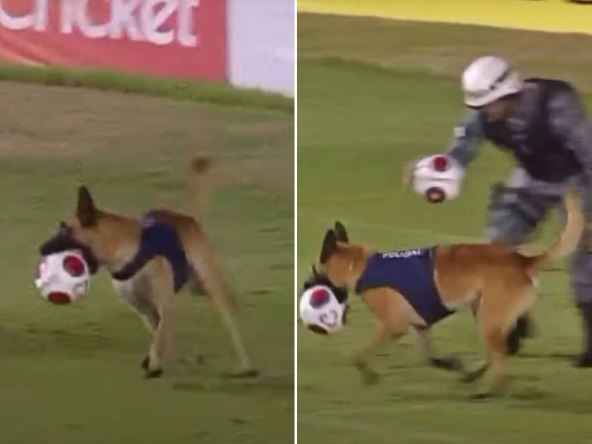 U pitanju je policijski pas koji je ušao na teren u 85. minutu, uzeo je loptu i krenuo da trči. Sudija je morao odmah da prekine meč, dok su igrači u šoku stajali i gledali šta se dešava. Na kraju su pripadnici policije ušli na teren i uspeli da sklone psa van granica igrališta.