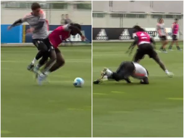 Dušan Vlahović je ušao u duel, ali nije uspeo da uzme loptu saigraču na treningu. Foto: Twitter/sBinottoFC/printscreen