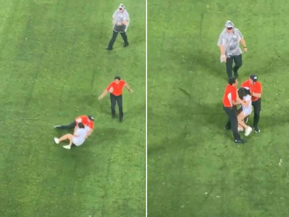 Iako nije jasno šta je ova devojka želela, na kraju nije uspela da stigne do cilja. Taman negde oko polovine terena jedan od redara je sačekao da mu se ona približi, a zatim obaranjem svojstenom američkom fudbaleru je oborio na tlo.