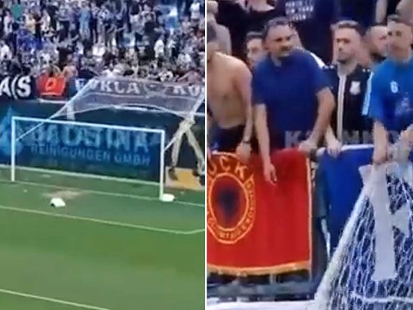 Rešili su da ne dozvole domaćim igračima da izvedu jedanaesterac, a to su pokušali da urade tako što su dohvatili mrežu gola i pokidali je! Huligani iza gola imali su brojne transparente, a vrlo jasno se mogla videti zastava terorističke UČK (Oslobodilačka vojska Kosova) odmah iza gola. Pogledajte kako je to izgledalo na terenu: