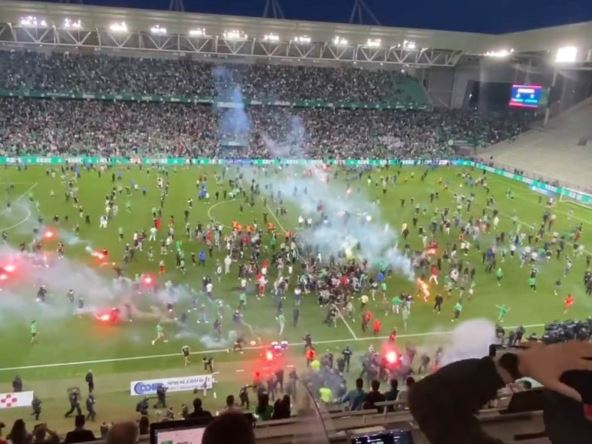 Dok su fudbaleri dva tima odlazili u svlačionicu, počeli su da naviru navijači sa tribina. Upali su na teren i napravili veliki haos, a sa tribina su poletele desetine baklji i petardi. Sve je bilo usmereno prema igračima Sent-Etjena koji su bukvalno morali da spašavaju živu glavu.