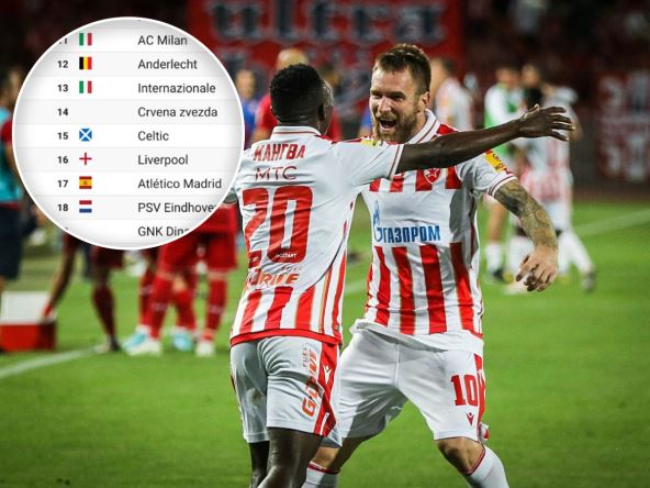 U TOP 10 slede i Bajern Minhen, Juventus, Ajaks, Mančester junajted, Porto, Dinamo Kijev i Rendžers. Zvezda je na 14. poziciji sa 101.867 osvojenih bodova, iza Milana, Anderlehta i Intera, a ispred velikana kao što su Seltik, Liverpul, Atletiko Madrid, PSV ili Arsenal.