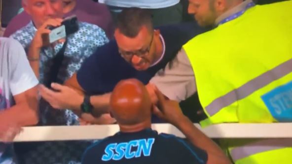 Navijač je krenuo rukom da udari trenera Napolija, i uspeo je blago da ga zakači prstima, dok je za to vreme neko od navijača bacio i plastičnu flašu u pravcu Spaletija - i pogodio ga. Došli su i igrači Napolija kako bi smirili svog "šefa", a sve se na kraju završilo bez ozbiljnijeg sukoba.