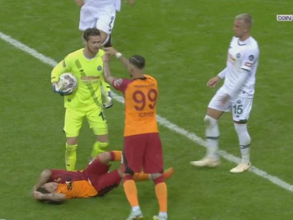 Argentinski napadač ušao je u klinč sa golmanom iz BiH Ibrahimom Šehićem, koji je u finišu susreta tražio kontakt u kaznenom prostoru. Pokušao je da "zakuva" situaciju sa Lukasom Toreirom, a kada se Urugvajac srušio na zemlju u prvi plan je iskočio Ikardi. Pozajmljeni fudbaler PSŽ-a bio je raspoložen za malo odgurivanja sa čuvarom mreže Konjaspora, a glavni arbitar meča podelio im je žute kartone zbog ovoga.