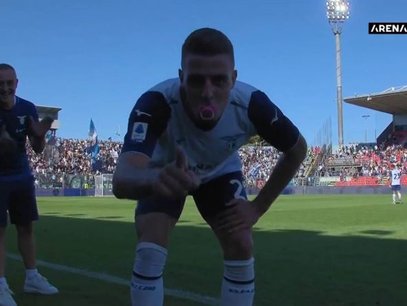 Potom je usledio sjajan potez - Milinković-Savić je otrčao da klupe Lacija i uzeo roze cuclu, koju je stavio u usta i potom poslao poljubac u kameru. A to je bio poseban način za srpskog vezistu da saopšti da će postati otac, što je i sam potvrdio posle meča. Evo kako je to izgledalo: