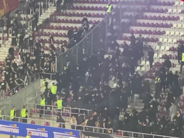 U međuvremenu počele su da lete baklje i stolice, bilo je i topovskih udara, a policija je ubrzo uspela da smiri dve navijačke grupe. Prekid utakmice trajao je oko minut, a kasnije nije bilo potrebe da se utakmica opet prekida. Pogledajte delić incidenata u Bukureštu: