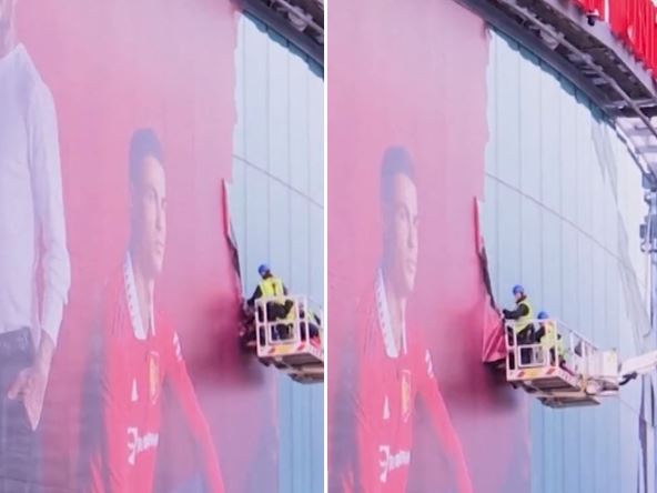Na snimku koji je napravljen ispred stadiona Mančester junajteda vidi se kako radnici zaposleni u klubu uklanjaju "tapete" zalepljene na spoljnoj strani tribine. Jedan do drugog na tom mestu su bili holandski stručnjak sa kojim portugalski fudbaler više nije u dobrim odnosima i povratnik u Mančester, čovek koji je još za vreme Aleksa Fergusona bio ljubimac navijača.