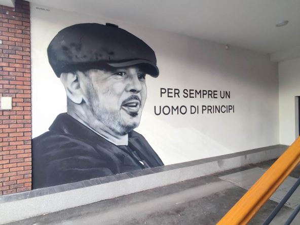 Oslikan je njegov lik sa prepoznatljivom kapom koja mu je otkako je počeo da se bori sa leukemijom postala zaštitni znak, a pored su ispisane reči koje ga na pravi način opisuju: "Per sempre un uomo di principi". Prevedeno na srpski, ono što je on bio: "Zauvek čovek principa!"
