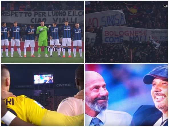 Prvo se na video bimu pojavio snimak posvećen Mihajloviću, nekadašnjem treneru Bolonje. Na to je publika reagovala gromoglasnim aplauzima. Potom je sudija Di Belo stavio loptu na centar, igrači su ga okružili i onda se pojavila srceparajuća fotografija. Na njoj su se nalazili Mihajlović i Vijali nasmejani, jedan pored drugog. Pojedinci na tribinama nisu mogli da zadrže suze zbog toga.