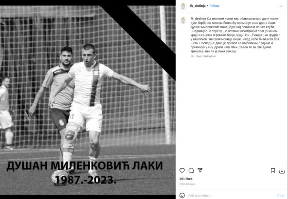"Sa velikom tugom vas obaveštavamo da je posle duge borbe sa teškom bolešću preminuo naš dragi Laki. Dušan Milenković Laki, jedan od osnivača našeg kluba, 'Sedmica'' na terenu, je ostavio neizbrisiv trag u našem kraju i srcima ogromnog broja ljudi. Ni 'Ćošak', ni fudbal u školskom, ni svlačionica više nikad neće biti ista bez njega. Poslednje dane je proveo sa najbližim ljudima i preminuo u snu. Dragi naš Laki, hvala ti za sve divne trenutke, nek ti je laka zemlja", navodi se u saopštenju kluba sa Dedinja.