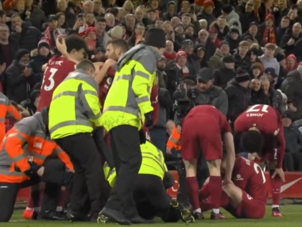 Najveći derbi u Engleskoj opravdao je očekivanja neutralnih ljubitelja Premijer lige pošto je Liverpul na svom terenu ubedljivo savladao Mančester junajted (7:0), ali jedan navijač tima sa Enfilda neće po dobrom pamtiti ovaj susret. Momak od 16 godinautrčao je u teren kako bi proslavio pogodak svog tima i tom prilikom povredio levog beka Endija Robertsona. Dok je škotski fudbaler slavio zagrljen sa saigračima, navijač mu je "uklizao" i naterao ga da se odmah uhvati za zglob.