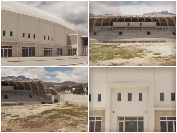 Radio-televizija Crne Gore obišla je ovo zdanje koje spolja izgleda spektakularno, a iznutra je nezavršeno, pa se tako vide korov, rupe... Upravo je oko trave najveći problem jer je jedna kompanija odbila da "završi" urađeno bez peska iz Tuzle, tako da i dalje traju previranja grada Cetinja, države Crne Gore i FS Crne Gore ko šta treba da plati.