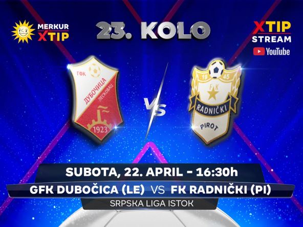 U subotu, 22. aprila od 16:30 časova, uživo, samo putem Xtip Stream-a na YouTube kanalu MerkurXtip-a pratite derbi susret Srpske lige – grupa Istok, između GFK Dubočice iz Leskovca i Radničkog iz Pirota.