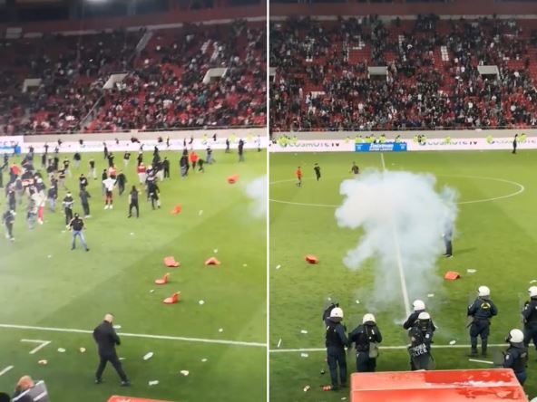 Kakav skandal u Grčkoj! AEK je savladao Olimpijakos 3:1 na gostovanju u Pireju, a nakon utakmice navijači domaćeg tima napravili su haos! Uleteli su na teren, počeli da bacaju stolice i baklje na travu, a onda napali i policiju.