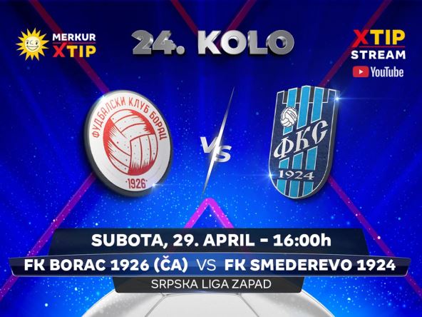 U subotu, 29. aprila od 16:00 časova, uživo, samo putem Xtip Stream-a na Youtube kanalu MerkurXtipa pratite susret Srpske lige – grupa Zapad, između Borca 1926 iz Čačka i Smedereva 1924.