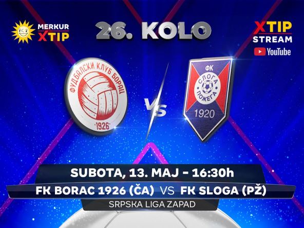 U subotu, 13. maja od 16:30 časova, uživo, samo putem Xtip Stream-a na YouTube kanalu MerkurXtipa pratite susret Srpske lige – grupa Zapad, između Borca 1926 iz Čačka i Sloge iz Požege.