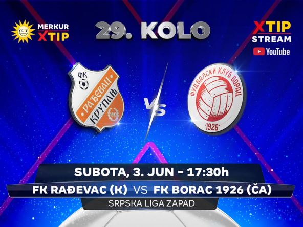 U subotu, 3. juna od 17:30 časova, uživo, samo putem Xtip Stream-a na YouTube kanalu MerkurXtip-a pratite susret Srpske lige – grupa Zapad, između Rađevca iz Krupnja i Borca 1926 iz Čačka.