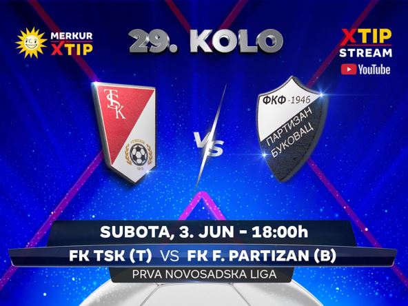 U subotu, 3. juna od 18:00 časova, uživo, samo putem Xtip Stream-a na YouTube kanalu MerkurXtipa pratite susret Prve Novosadske lige, između TSK iz Temerina i Fruškogorskog partizana iz Bukovca.