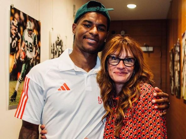 Dobitnica Oskara za film "Erin Brokovič" iz 2001. pozirala je zajedno sa menadžerom Junajteda, Holanđaninom Erikom Ten Hagom, a štoper engleskog kluba Lisandro Martinez (25) poklonio joj je svoj dres sa "šesticom" na leđima.