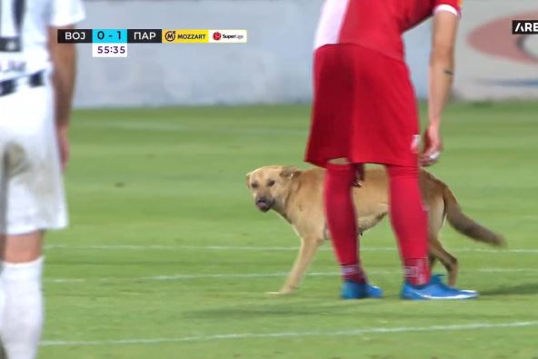 Derbi Superlige Vojvodina - Partizan prekinut je u toku drugog dela meča jer je na teren utrčao pas. Prekid je trajao minut-dva, pojedini igrači Vojvodine pokušali su uhvate psa i da ga iznesu, iako je ženka na jednog zarežala. Potom je ipak sama otrčala sa terena i na ulicu. Pogledate kako je to izgledalo: