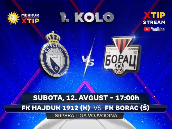 U subotu, 12. avgusta od 17:00 časova, uživo, samo putem Xtip Stream-a na YouTube kanalu MerkurXtip-a pratite susret Srpske lige – grupa Vojvodina, između Hajduka 1912 iz Kule i Borca iz Šajkaša.
