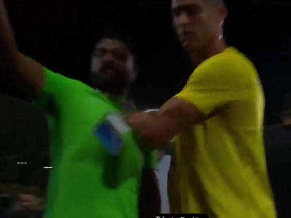 Vikao je na nekoga, delovao kao da je spreman da se fizički obračuna sa saigračima, da bi potom gurnuo i jednog muškarca koji se našao na terenu. Nije poznato da li je u pitanju navijač ili član jednog od dva kluba koji je možda angažovan za društvene mreže ili na sličnom poslu, a koji nije "dizao frku" kada je Ronaldova ruka završila na njegovim grudima. Videlo se da Ronaldu smeta što mu se našao na putu i zato ga je odgurnuo.