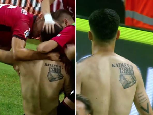 Napadač iz Gnjilana na desnom ramenu tetovažu posvećenu terorističkoj organizaciji "Oslobodilačka vojska Kosova", paravnojnoj formaciji koja je krajem devedesetih ratovala protiv Jugoslavije i zalagala se za separatizam na Kosovu i Metohiji. Na ramenu albanskog fudbalera koji je do skoro nastupao za reprezentaciju "Kosova", pa odlučio da to promeni, mogu se videti nadimak "Katana", broj 138 i noga koja stoji na kamenu koji simbolizuje granicu tadašnje Jugoslavije i Albanije.
