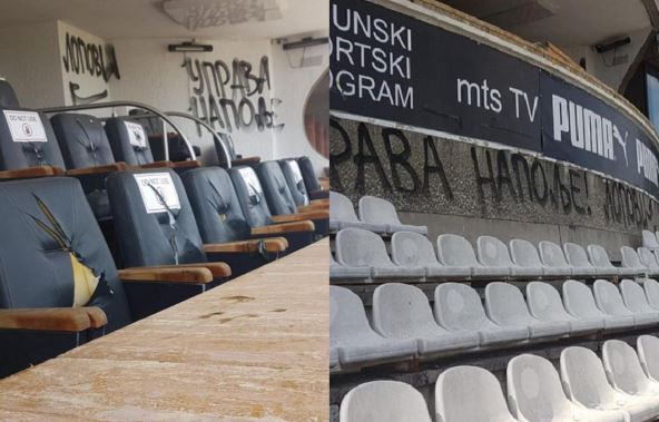 Na dan utakmice FK Partizan - Radnik Surdulica (nedelja, 19.35), svečana loža stadiona u Humskoj je ruinirana. Grobari su objavili fotografije na kojima se vidi da su stolice isečene i da su po zidovima lože ispisani uvredljivi grafiti. "Nećete sedeti tamo gde ste pošli, u našoj kući niste dobrodošli", piše u toj objavi Partizanove navijačke grupe na Instagramu.