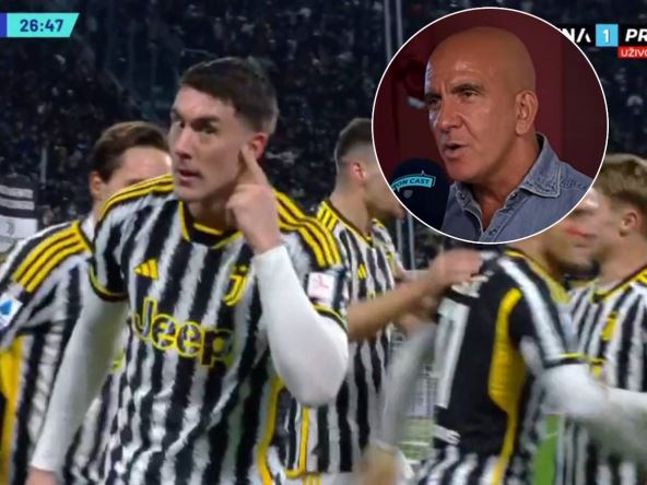 Srpski golgeter Dušan Vlahović dao je gol na derbiju Juventus - Inter, a onda je odmah pogledao ka kameri i gestikulirao nekome da nastavi da priča. "Da te čujem sad!", kao da je poručio Srbin kada je pogledao ka kameri sa stavljenim prstom na uvetu. A na koga je mislio? Sasvim izvesno na Paola Di Kanija!