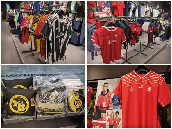 Samo nekoliko koraka dalje, u okviru tržnog centra, nalazi se specijalizovana prodavnica sportske opreme koja je izuzetno dobro snabdevena. Kopačke, lopte, sva moguća vrsta opreme, ali i fudbalski dresovi slavnih evropskih klubova izloženi su javnosti. Što se fudbalskih dresova tiče, teško je očekivati da ih neko kupuje na ovakvom mestu, čak i kada bi se radilo o opremi nacionalnog tima koju "reklamira" Granit Džaka. Dečiji dresovi najvećih evropskih ekipa koštaju 90 franaka, dok je dres za odrasle između 110 i 120. U ponudi su Real, Barselona, PSŽ, Juventus, Roma, Liverpul, Arsenal, Mančester junajted...