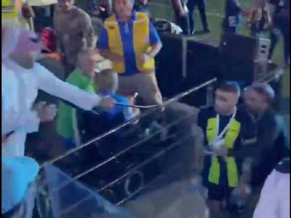 Za sada nije objašnjeno do kraja šta se desilo, ali na snimku se vidi fudbaler Hamdala iz Al Itihada, koji je dao gol nakon što se "ispravio" zbog promašenog jedanaesterca, koji prilazi tribini. Tamo primećujemo muškarca koji se svađa sa njim, a zatim ga Hamdala prska vodom, da bi potom navijač krenuo da ga udara bičem!? Zaista nezapamćena scena koja je viđena u Abu Dabiju i zbog koje će najverovatnije reagovati FIFA.
