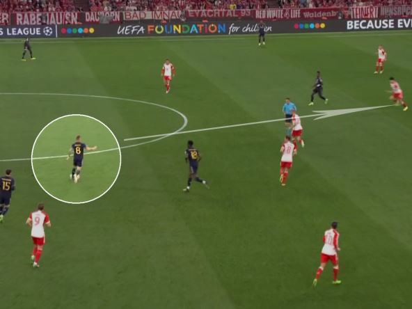 Na snimku iz drugog ugla, jasno se vidi da je Toni Kros, pre nego što je poslao "torpedo" za Vinisijusa, jasno i pokazao Brazilcu da se ubaci iza leđa odbrane. Dve sekunde pre tog dodavanja, kratko je prstom pokazao i usmerio svog napadača gde će mu poslati loptu, a zbog perfektnog tajminga ni Kim, ni Kimih, ni Nojer nisu mogli ništa.