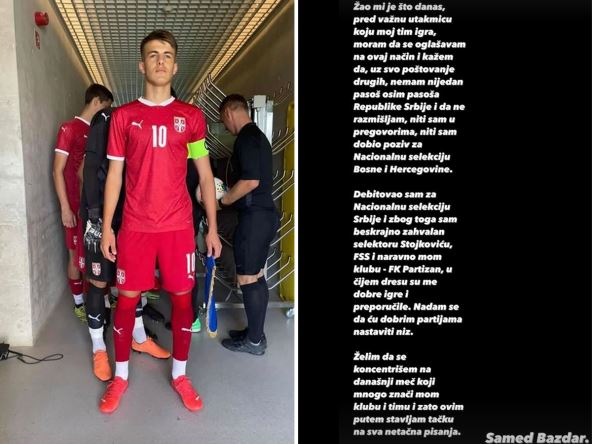 "Žao i je što danas pred važnu utakmicu koju moj tim igra moram da se oglašavam na ovaj način i kažem da, uz svo poštovanje drugih, nemam nijedan pasoš osim pasoša Republike Srbije i da ne razmišljam, niti sam u pregovorima, ntii sam dobio poziv za nacionalnu selekciju Bosne i Hercegovine. Debitovao sam za nacionalnu selekciju Srbije i zbog toga sam beskrajno zahvalan selektoru Stojkoviću, FSS i naravno mom klubu FK Partizan, u čijem dresu su me dobre igre i preporučile. Nadam se da ću dobrim partijama nastaviti niz. Želim da se koncentrišem na današnji meč koji mnogo znači mom klubu i timu i zato ovim putem stavlja tačku na sva netačna pisanja", napisao je na svom instragram profilu Samed Baždar.